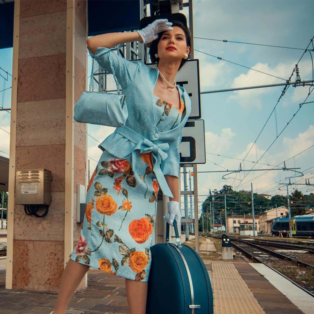 Qui ho portato l’azzurro nelle mie creazioni, nel vestito GIGLIO e la giacca ROSA.