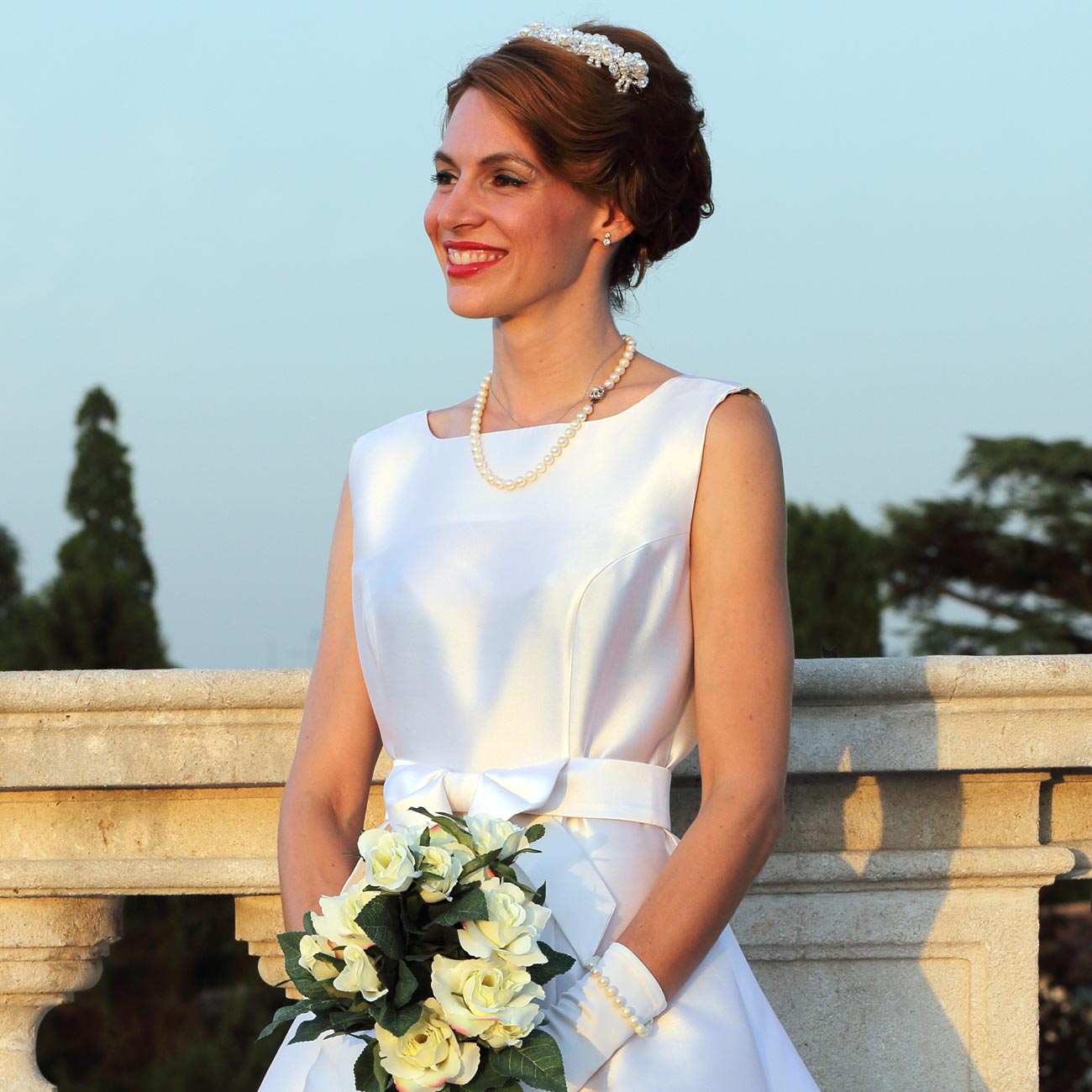 Se scegli un abito in mikado dal taglio semplice per il tuo matrimonio abbina un lungo velo prezioso, ricamato e arricchito da pizzo e applicazioni e accessori estremamente sobri.