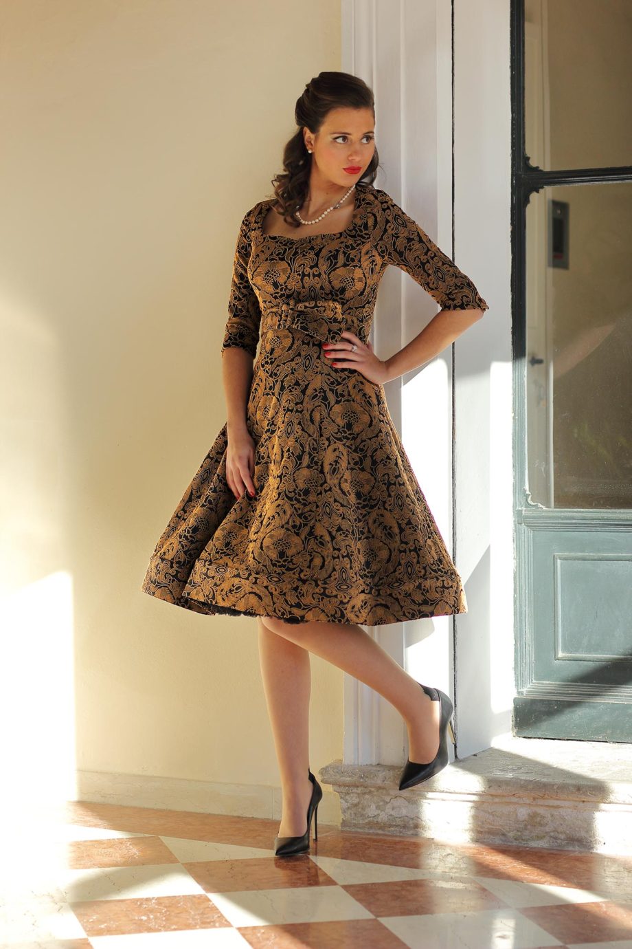 Lo addolciscono le maniche a tre quarti che scoprono mani e braccia con estrema discrezione.